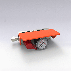 Kontrolní armatura mikro 2480.00.34.11.1/13.1 slouží k nepřetržitému monitorování plnicího tlaku jedné nebo více plynových pružin (2x5 přípojky M6, horní strana, spodní strana a 4x boční strana). Upozornění: